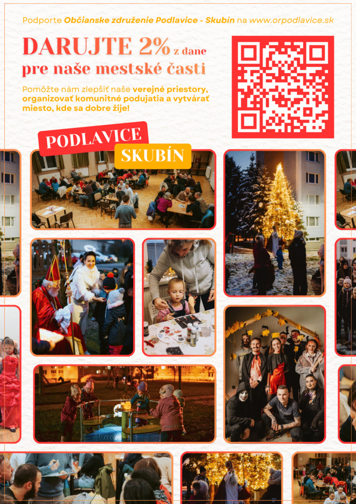 Sme občianske združenie, ktoré aktívne pracuje v našich mestských častiach Podlavice a Skubín. Organizujeme komunitné podujatia, ktoré spájajú ľudí, a pomáhame skrášľovať naše okolie, aby sme mali krajšie miesto pre život. Vaše 2% z dane nám pomôžu pokračovať v našej práci a prinášať ešte viac radosti do našej komunity.